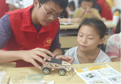这群身着红马甲的理工学子,是课程的设计者,更是成长的陪伴者。他们将专业所长融入教学实践:既化身“安全导师”,用代码思维解析网络风险;又变身“文化使者”,让非遗技艺焕发新彩。课堂上是循循善诱的小老师,课间是并肩游戏的大朋友,他们以青春之力,让志愿服务既有温度,更显专业。
